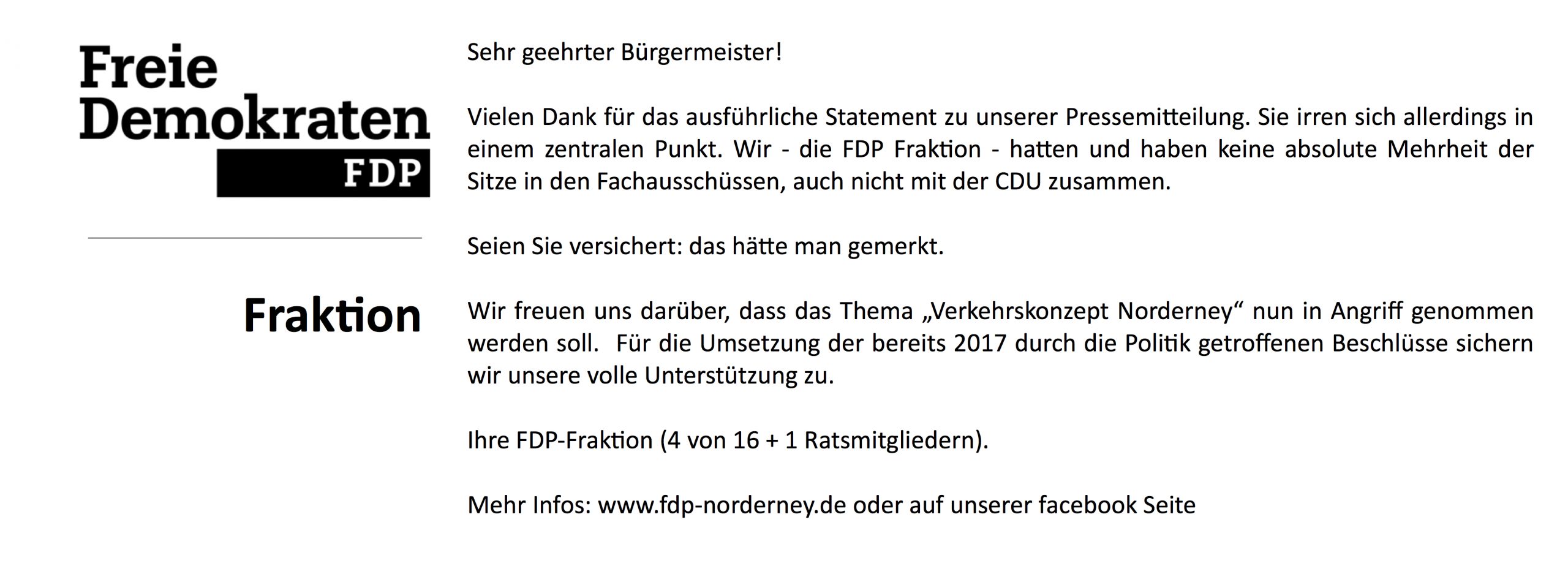 Es ist uns wichtig richtigzustellen, dass weder die FDP alleine noch die Gruppe FDP/CDU eine Stimmenmehrheit in den Fachausschüssen hat. Die FDP ist bei Abstimmungen immer an der Sache orientiert! Jenseits jeder Ideologie haben wir in der Vergangenheit auch in Übereinstimmung mit der SPD, den GRÜNEN, der CDU und/oder den Freien Wählern gestimmt – unter anderem für ein Verkehrskonzept für Norderney.
